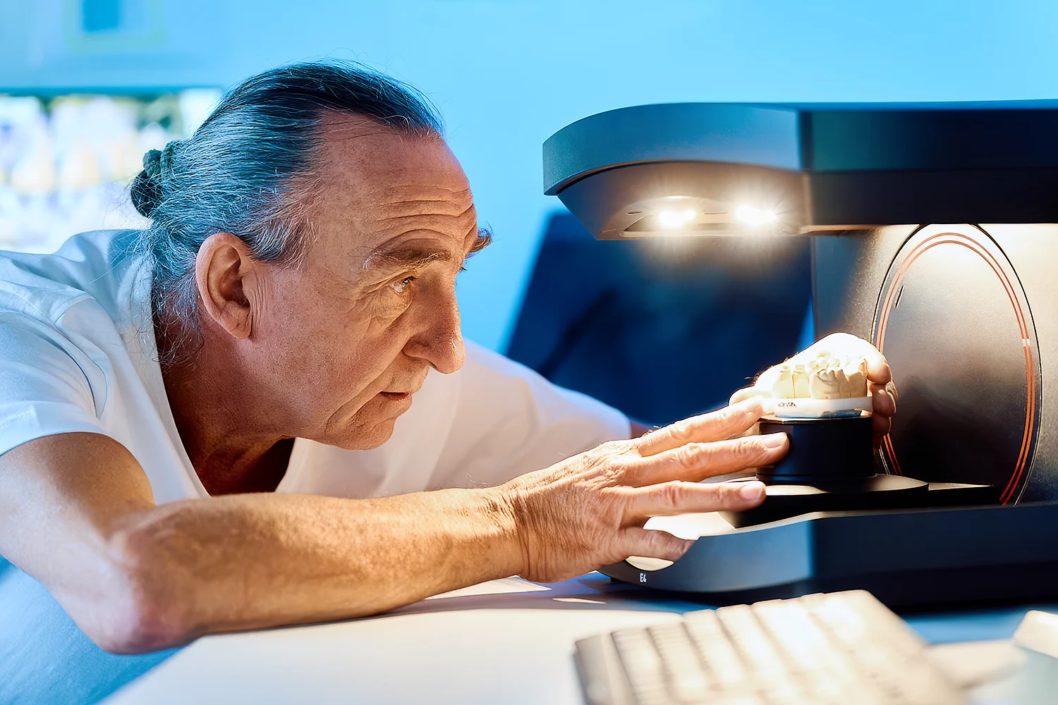 Wir arbeiten mit „3Shape“ und „ExoCAD“ und fräsen auf Datron und VHF Maschinen.